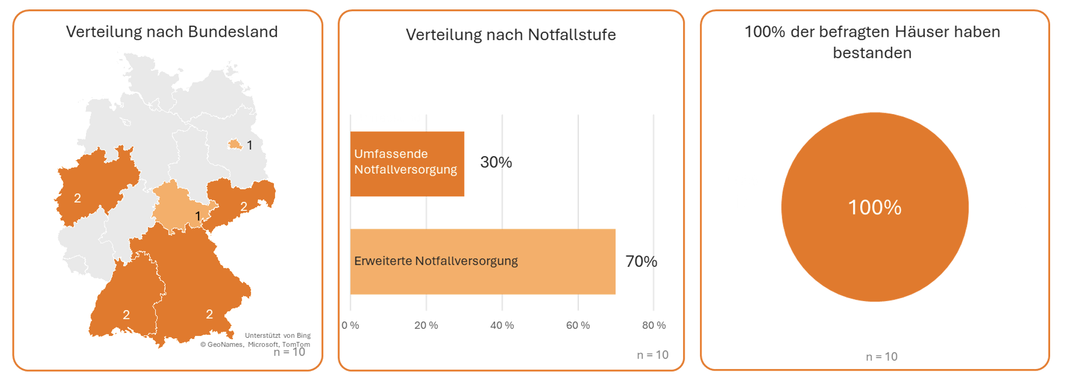 Mit der Umfrage konnten wir Krankenhäuser in vielen Bundesländern mit Erweiterter und Umfassender Notfallstufe der Kindernotfallversorgung erreichen. In diesem Jahr haben alle befragten Häuser die Prüfung des medizinischen Dienstes bestanden! In der Stichprobe haben sich 70% der befragten Häuser der erweiterten und 30% der umfassenden Notfallversorgung zugeordnet.