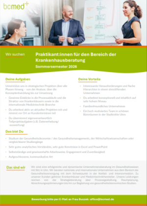 Lernen Sie die Arbeit der Krankenhausberatung im Rahmen eines 6-monatigen Praktikums genau kennen. Unterstützen und begleiten Sie unser motiviertes, hoch qualifiziertes Team und erhalten Sie vielfältige Einblicke in spannende Beratungsprojekte.